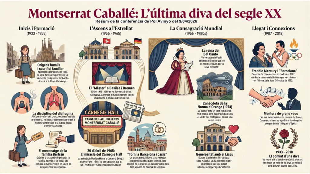 El passat 9 d’abril de 2026, l’Aula va acollir una apassionant conferència dedicada a la figura de Montserrat Caballé, l’última diva del segle XX . La sessió va anar a càrrec de Pol Avinyó, reconegut historiador, divulgador musical i vinculat professionalment al Gran Teatre del Liceu . Des de la devoció i el coneixement personal, Avinyó ens va oferir un emotiu i rigorós recorregut cronològic per la vida i el llegat d’aquesta irrepetible soprano.
