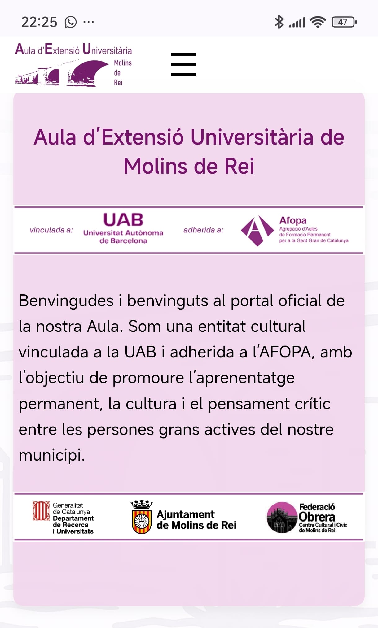 La nova web destaca per la seva gran utilitat com a portal d’informació i difusió, centralitzant de manera clara i intuïtiva tot el programa de cursos, conferències i sortides culturals. La web, senzilla i funcional, permet a l’Aula avançar en accessibilitat, facilitant a la ciutadania consultar el seu programa i connectar amb l’entitat de forma clara i directa.