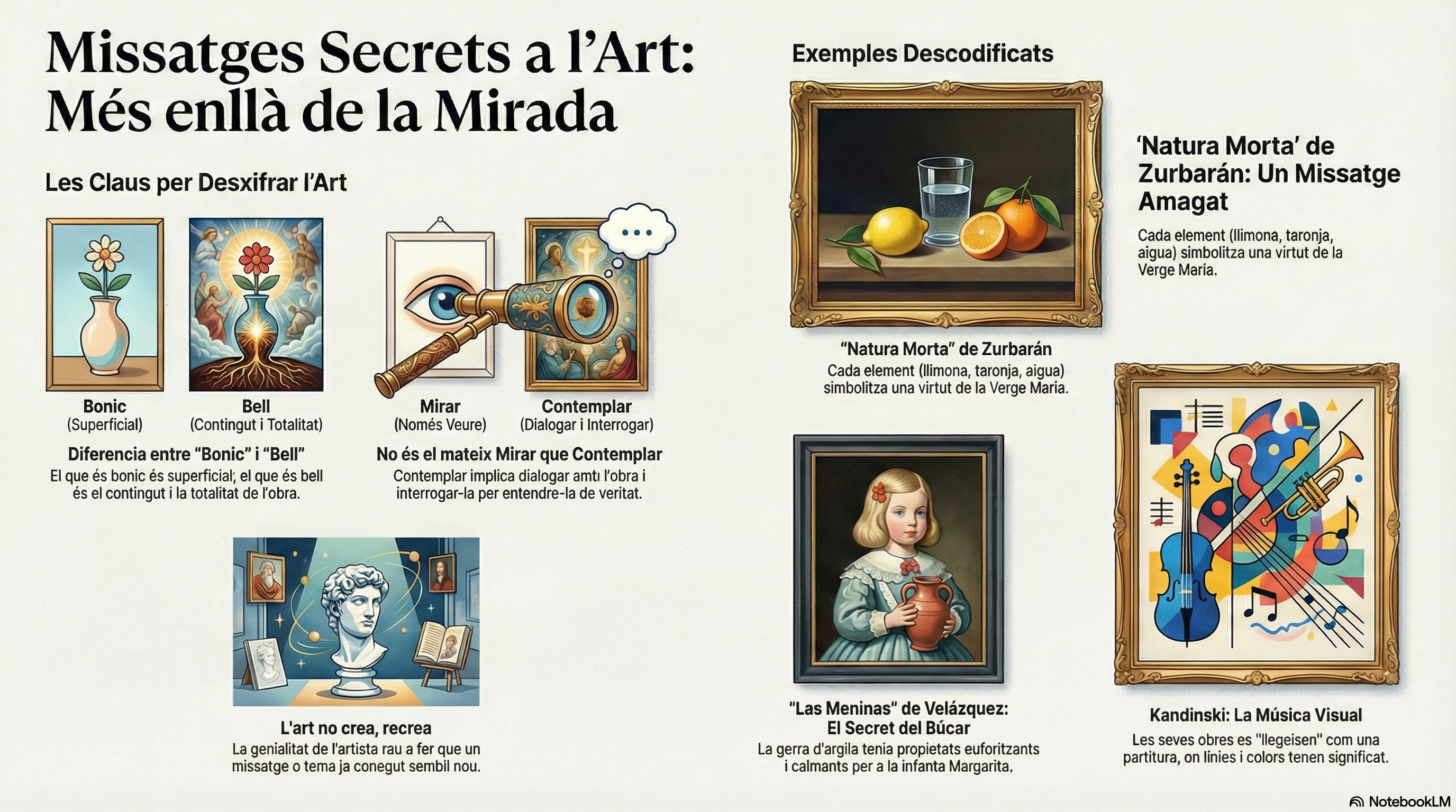 1. Bonic versus Bell (amb B alta): La Dra. Fernández va instruir l’audiència a diferenciar el que és bonic (l’aparença superficial) del que és bell, que fa referència al contingut i la totalitat de l’obra,. Per exemple, en una obra del segle XVI d’Antoni Cànova, la bellesa real resideix en el contingut semàntic sobre el bon amor o el matrimoni per conveniència, i no en el tema mític superficial,.