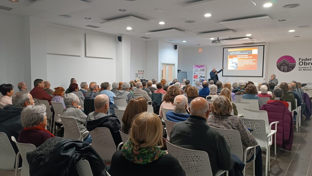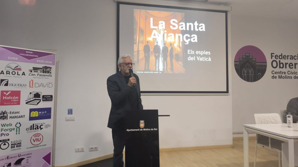 Molins de Rei, 27 de novembre. La Federació Obrera es va quedar petita per acollir la conferència «Els Espies del Vaticà», a càrrec de Vicenç Lozano i Alemany. Convidat per l’Aula d’Extensió Universitària, l’exredactor de la secció internacional de TV3 va captivar el públic amb un relat que, segons les seves pròpies paraules, «supera àmpliament la ficció».